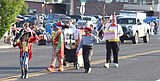 Nichole Hernandez, right, and her family circus walk down Third Avenue in the Moses Lake …