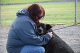 Grant County Animal Outreach Manager Cyndle Miller gives long-term resident Zeus a hug. He may …