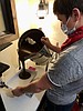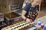 Lisa Boorman decorates some chocolate covered donuts with vanilla icing.