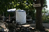 A sign nailed to a tree at an encampment of those dealing with homelessness says …