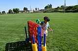 One Warden summer school student jumps rope to an oversized Connect Four board and places …