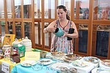 Treasures in hand, a shopper heads for the cash register at the Rusty Mammoth sale.