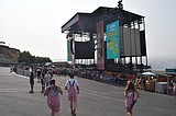 Concert goers rocking American Flag overalls walk to the main stage. Each day of Watershed …