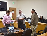 Othello Police Chief Dave Rehaume, right, is presented with a plaque by Mayor Shawn Logan, …