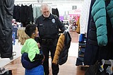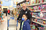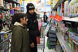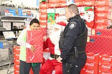 Othello Police Department Officer Tyson Cox (left) runs a price check for Riley Sams (center) …