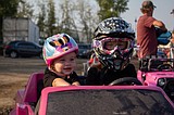 A young girl watches some of the other demo drivers from her decorated pink Power …