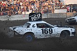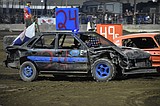 A Demo Derby driver races around the corner of the dirt track during the timed …