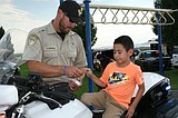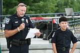 Quincy Police Chief Keith Siebert (left) introduces the Chief for a Day, Christopher James, during …