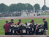 The coaching staff speaks with the Jr. Mavs fourth-grade team as they prepare to face …