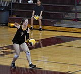 Bella Minor, a senior for the Mavs, prepares for a serve during the first set …