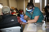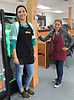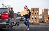 Volunteer Melissa Cazin loads a box of food into the back of a truck at …