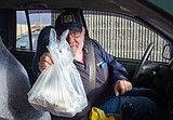 Doug Gambriel holds up his Thanksgiving dinner with a smile after coming through the drive-thru …