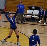 Soap Lake senior Liana Sushik prepares to serve the ball during one of the volleyball …