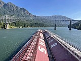 The Shaver Transportation tugboat Lincoln and a tow of four barges full of wheat approach …
