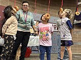Children try their hands – well, actually they can’t use their hands – in the …