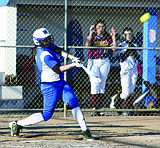Coach Dave Gregory congratulates Vanessa Rodriguez after she hit a 3-run home run in the …
