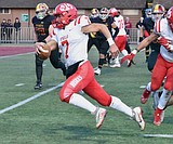 Ephrata quarterback Travis Hendrick runs the ball upfield on a quarterback power run.