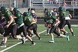 A Quincy running back runs behind a wall of offensive linemen against the Connell defense.