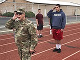 Air Force Maj. James Barnett demonstrates to MLHS sophomore Alaia Archer how to properly stand …