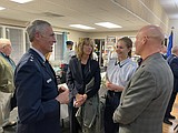 Retired U.S. Air Force Maj. Gen. R. Mike Worden, left, speaks with Kathy Henke, her …