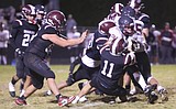 Mattawa’s defense piles on the Grandview ball carrier to make a tackle in the backfield.