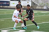 Royal junior Alexis Gonzalez (19) defends against a College Place player during Saturday’s match.