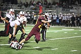 Moses Lake senior running back Maddox Gwinn powers through a tackle on a 15-yard run …