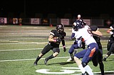 Senior running back Kaleb Hernandez cuts upfield to run through a hole made by the …