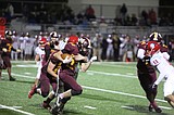 Maverick running back Maddox Gwinn (23) fights for extra yards, running through Eastmont tacklers.