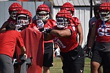 The Eastern defensive line unit works with a blocking sled at practice on Thursday.