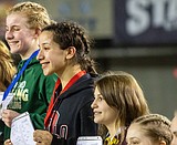 Members of the Moses Lake High School Swim team show shock and excitement when they …