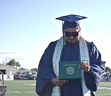A Big Bend Community College graduate checks out his diploma while walking back to his …