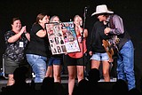 Grant County Fairgrounds staffer Darci Homesley presents Ned LeDoux with a framed copy of the …