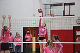 Broncos senior Taylor Galbreath taps the ball over the net for a kill in the …