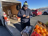 Produce seller Hernani Correia runs a customer’s debit card at the outdoor produce stand he …