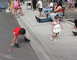 Four-year-old Daymon Lauriano, left, and Mia Sotello, 2, go after candy tossed to the crowd …