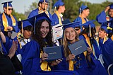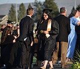 New graduate Fatima Madrigal Villa crosses the stage with her diploma to shake hands with …