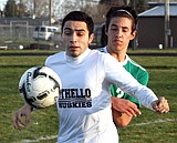 Othello's Isabel Hardiek battles a Selah forward for control of the ball during the Huskies …
