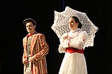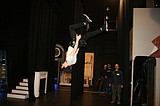 Taylor Street (upside down) practices flipping through the air. Street plays Bert in the Quincy …