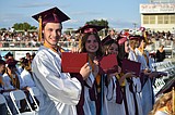 Three seniors show off their new diplomas at Moses Lake High School graduation.