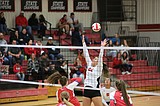 Bronco sophomore Saige Galbreath leaps in the air for a spike during the fourth set …