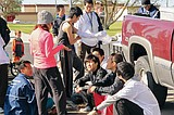 Offensive tackle Carter Christensen blocks a Kodiak linebacker while Damien De La Rosa takes a …