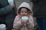 Ruth Gladieux-Smith, 4, savors her hot chocolate as she waits with her family in Sinkiuse …
