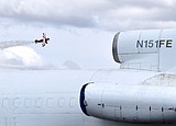 Stunt pilot Yuichi Takagi takes to the sky behind a parked Boeing 767 at the …