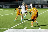Samantha Dela Rosa fights for balance and control of the ball along the sideline during …