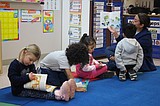 Children look through the books and listen to Nelida Ontiveros read a story in the …