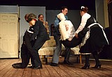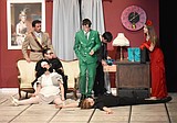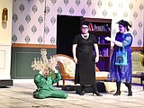 Professor Plum (Justin Martin), left, carries Mr. Boddy’s body to the couch while Mr. Green …
