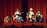 Party guests eat dinner before chaos arises in “Clue: On Stage.” From left to right: …
