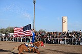 A trick rider with this year’s Last Stand Rodeo rides around the arena Saturday evening, …