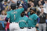 Seattle Mariners' Kyle Lewis (1) is greeted at the dugout by J.P. Crawford, right, after …